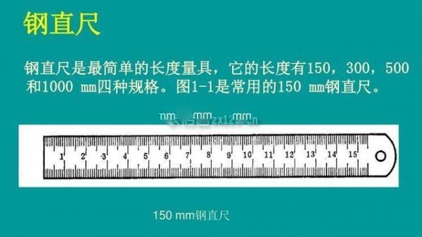 钢直尺是最简单的长度量具,用于测量零件的长度尺寸,它的长度有150,300,500和1000 mm四种规格。